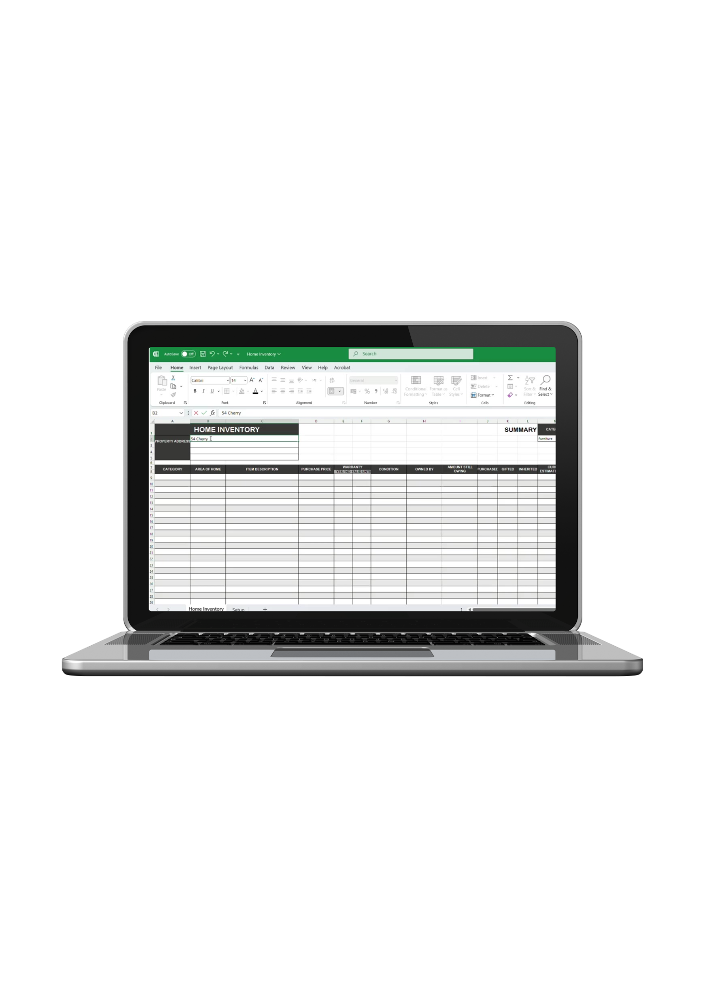•    Columns for category, item description, estimated value, ownership, notes, and more.